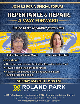 Roland Park Presbyterian Church is hosting an in-person forum titled Repentance & Repair: A Way Forward on Sunday, March 1st.